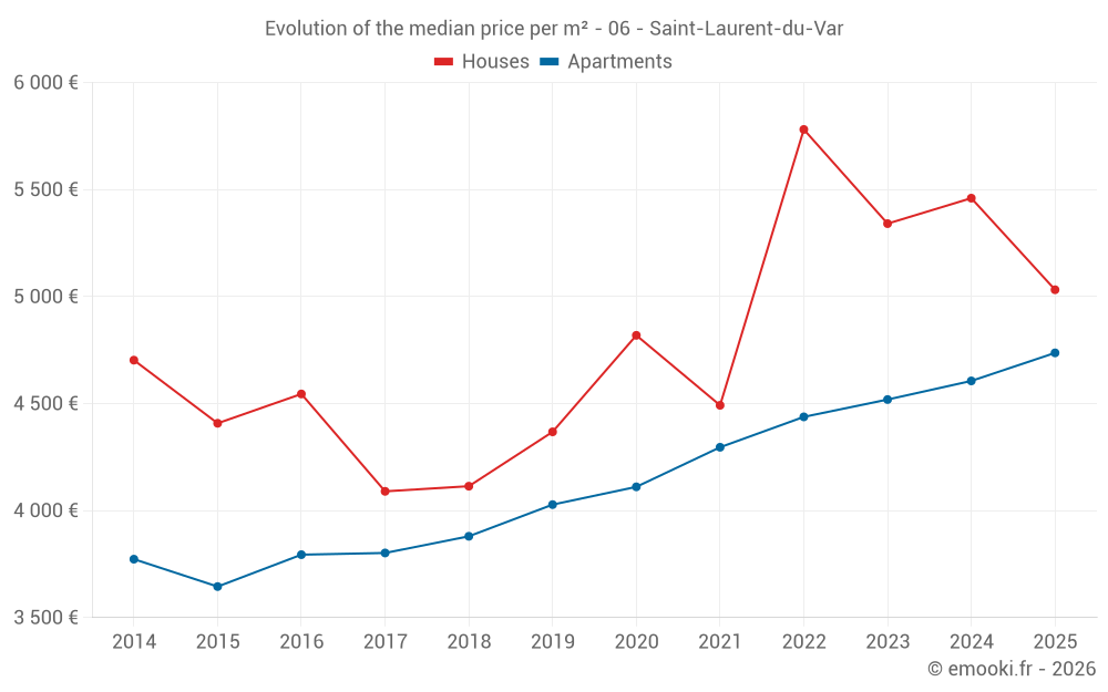 The median price on the 24 house transactions of the last 6 months in the municipality of Saint-Laurent-du-Var was 5 032 € per square meter for a median property value of 530 750 €. Over this period, 60% of transactions were between 4 520 and 6 848 € per square meter (from the 2nd to the 8th deciles).