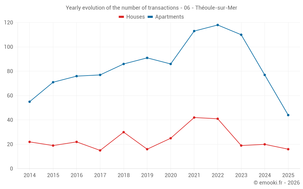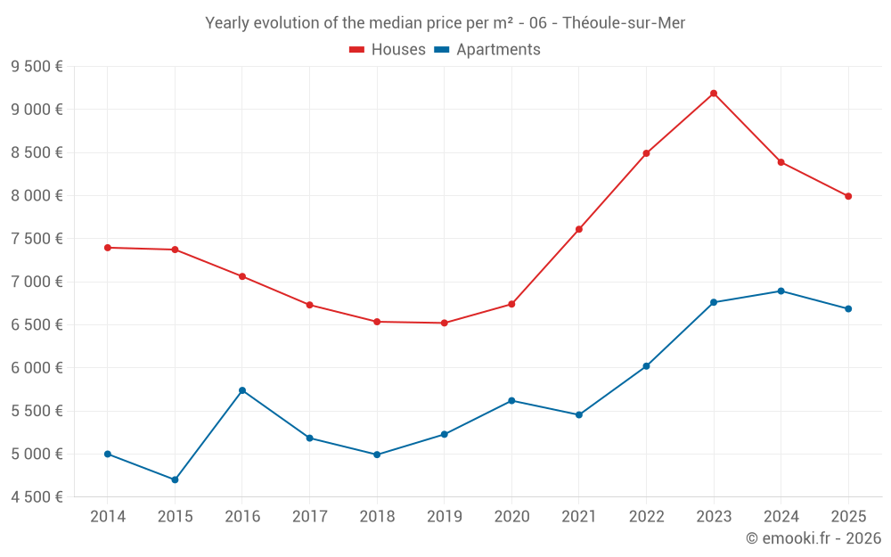 The median price on the 27 house transactions of the last 12 months in the municipality of Théoule-sur-Mer was 8 307 € per square meter for a median property value of 670 000 €. Over this period, 60% of transactions were between 6 729 and 11 424 € per square meter (from the 2nd to the 8th deciles).