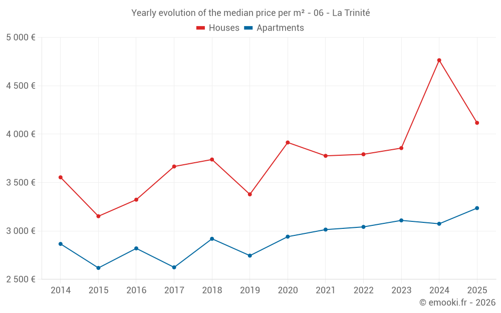 The median price on the 27 house transactions of the last 12 months in the municipality of La Trinité was 4 727 € per square meter for a median property value of 375 000 €. Over this period, 60% of transactions were between 3 323 and 5 690 € per square meter (from the 2nd to the 8th deciles).