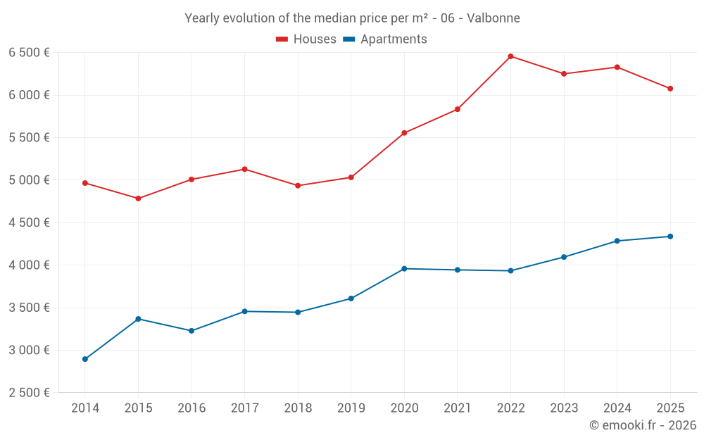The median price on the 23 house transactions of the last 6 months in the municipality of Valbonne was 6 076 € per square meter for a median property value of 679 245 €. Over this period, 60% of transactions were between 4 514 and 7 559 € per square meter (from the 2nd to the 8th deciles).