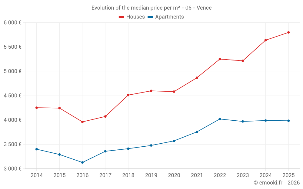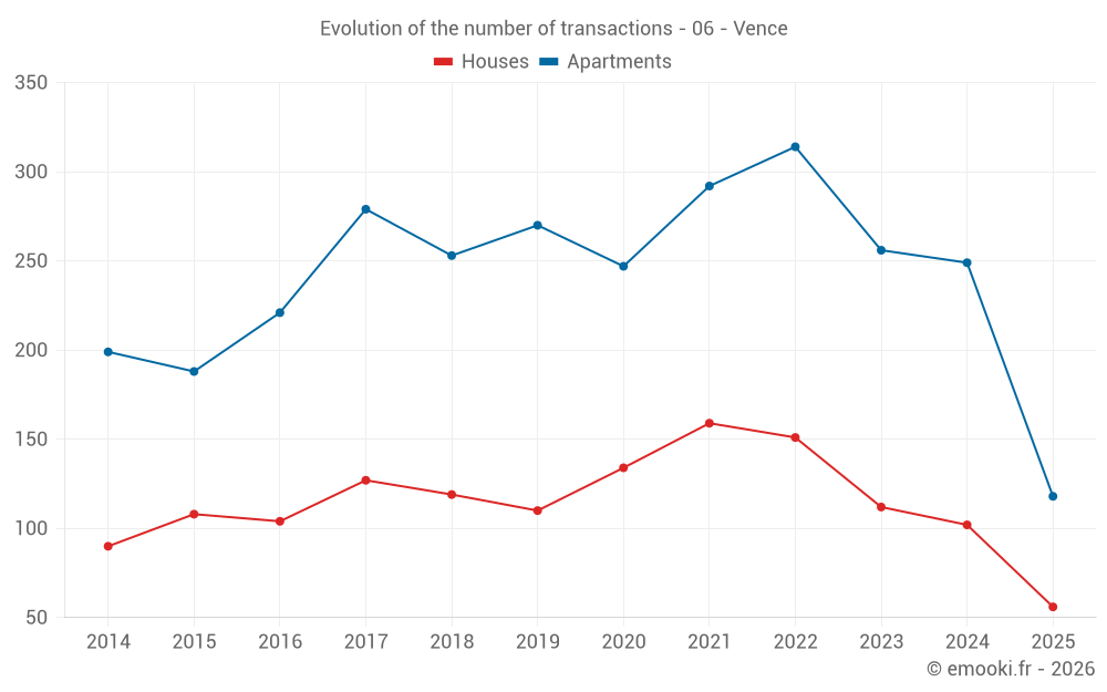 The median price on the 63 apartment transactions of the last 3 months in the municipality of Vence was 4 195 € per square meter for a median property value of 210 000 €. Over this period, 60% of transactions were between 3 293 and 4 996 € per square meter (from the 2nd to the 8th deciles).