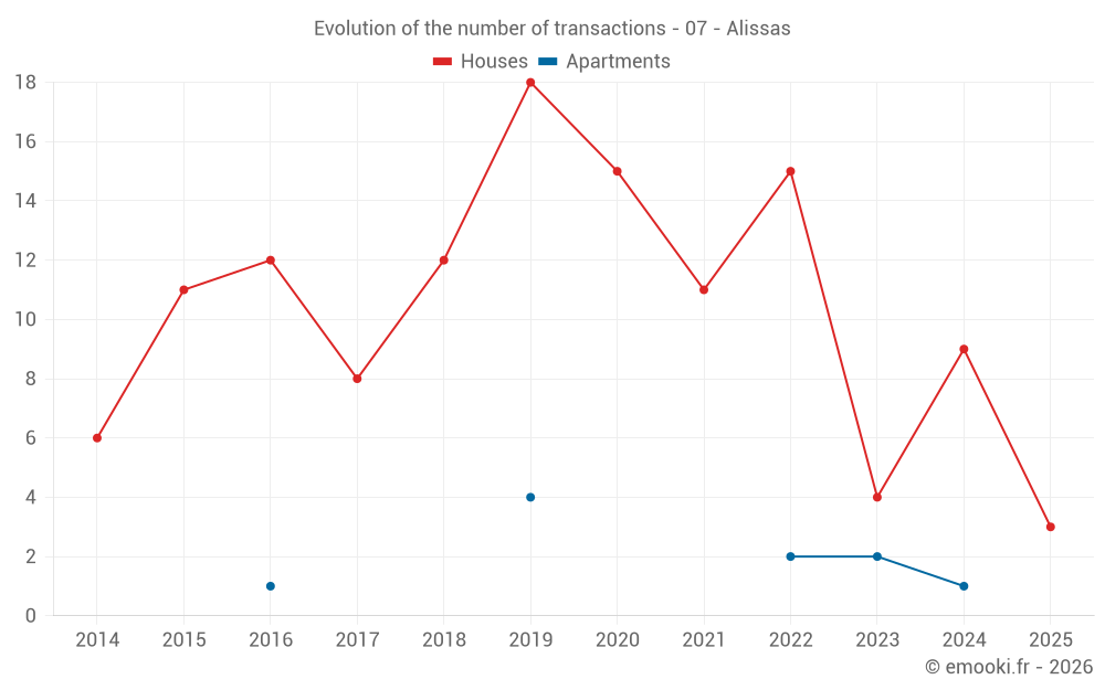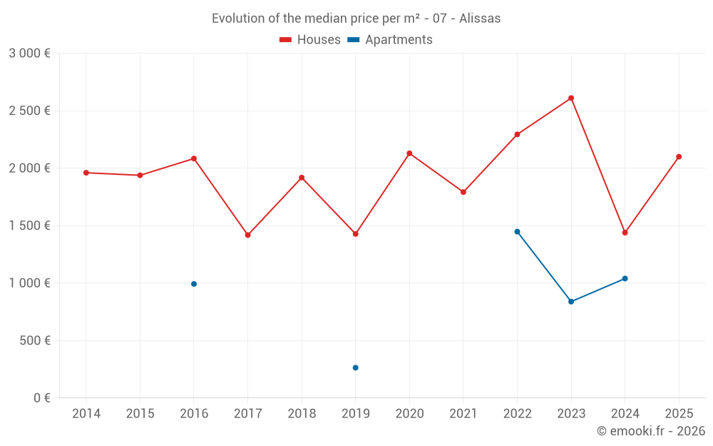 The median price on the 15 house transactions of the last 24 months in the municipality of Alissas was 2 200 € per square meter for a median property value of 210 000 €. Over this period, 60% of transactions were between 1 207 and 3 132 € per square meter (from the 2nd to the 8th deciles).