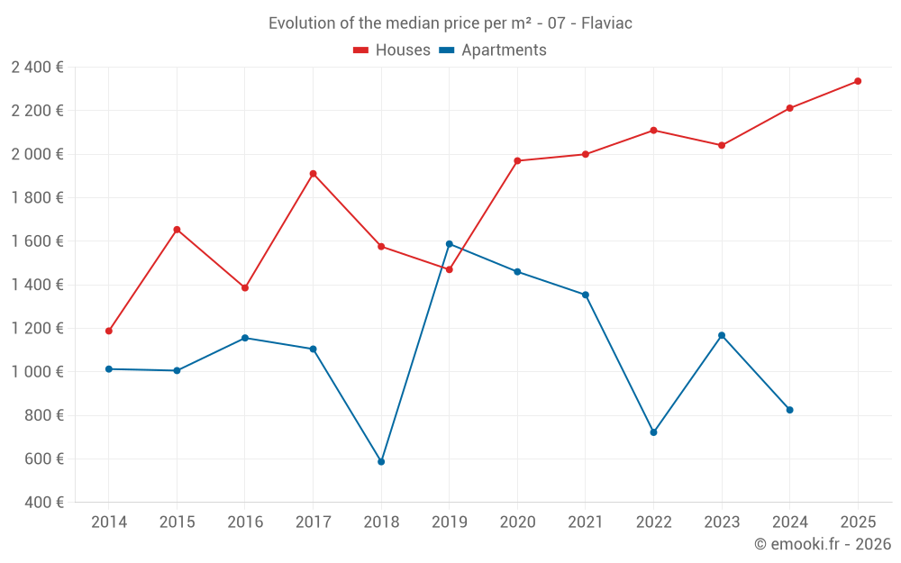 The median price on the 20 house transactions of the last 24 months in the municipality of Flaviac was 2 103 € per square meter for a median property value of 178 500 €. Over this period, 60% of transactions were between 1 565 and 2 559 € per square meter (from the 2nd to the 8th deciles).