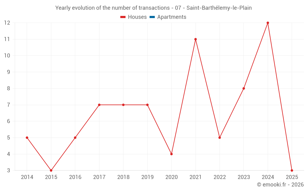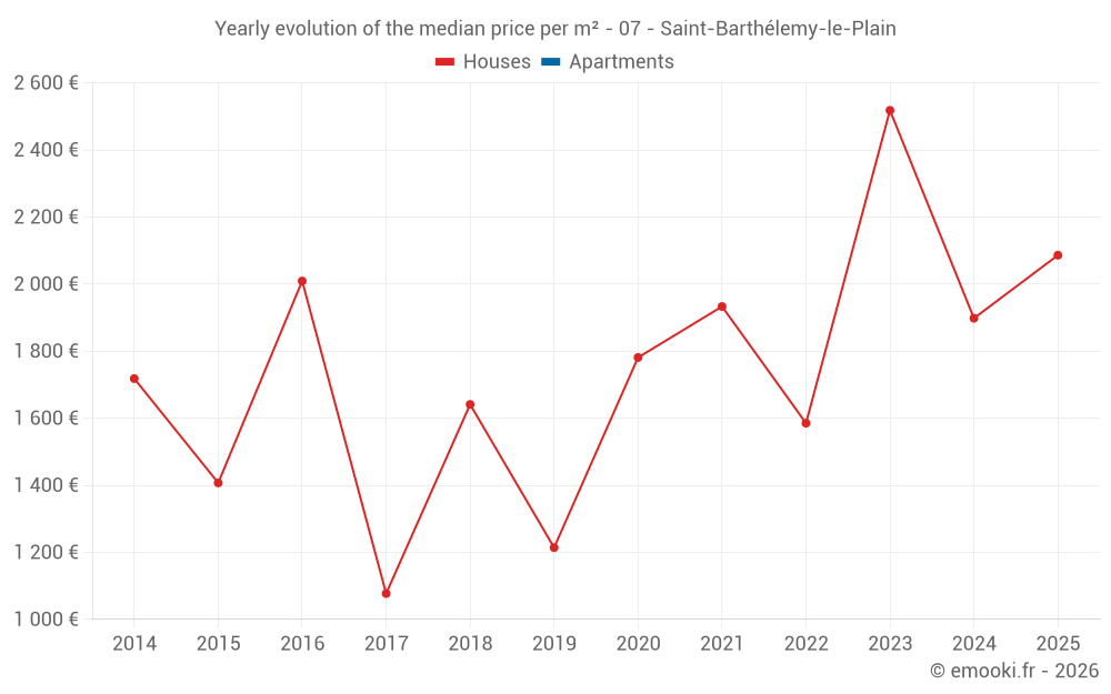 The median price on the 20 house transactions of the last 24 months in the municipality of Saint-Barthélemy-le-Plain was 1 954 € per square meter for a median property value of 150 000 €. Over this period, 60% of transactions were between 1 355 and 2 578 € per square meter (from the 2nd to the 8th deciles).