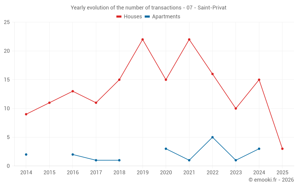 The median price on the 23 house transactions of the last 24 months in the municipality of Saint-Privat was 1 864 € per square meter for a median property value of 202 350 €. Over this period, 60% of transactions were between 1 316 and 2 765 € per square meter (from the 2nd to the 8th deciles).