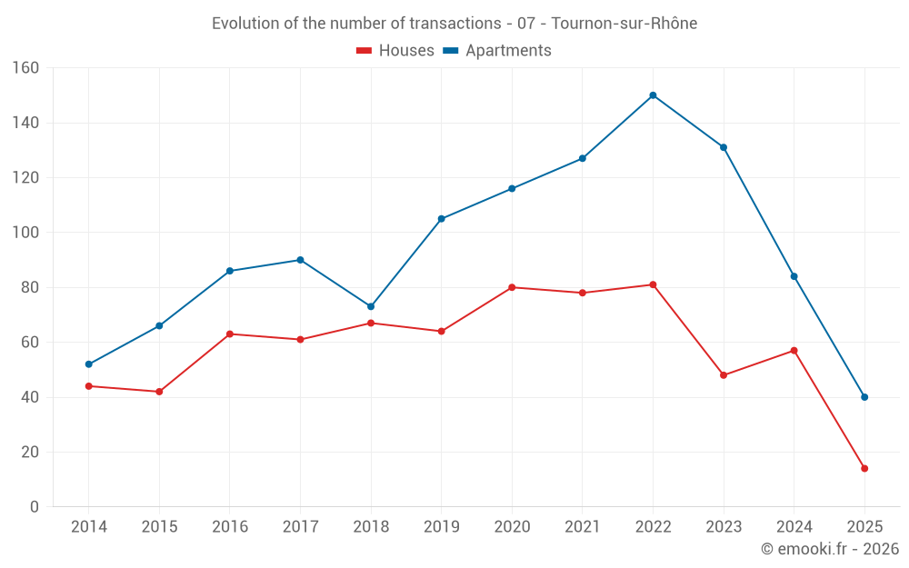 The median price on the 40 apartment transactions of the last 6 months in the municipality of Tournon-sur-Rhône was 1 825 € per square meter for a median property value of 124 500 €. Over this period, 60% of transactions were between 1 463 and 2 149 € per square meter (from the 2nd to the 8th deciles).