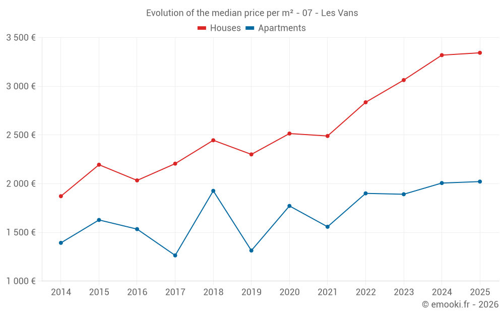 The median price on the 16 apartment transactions of the last 12 months in the municipality of Les Vans was 1 918 € per square meter for a median property value of 149 800 €. Over this period, 60% of transactions were between 865 and 2 643 € per square meter (from the 2nd to the 8th deciles).