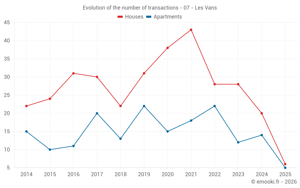 The median price on the 38 house transactions of the last 24 months in the municipality of Les Vans was 3 111 € per square meter for a median property value of 256 000 €. Over this period, 60% of transactions were between 1 789 and 3 907 € per square meter (from the 2nd to the 8th deciles).
