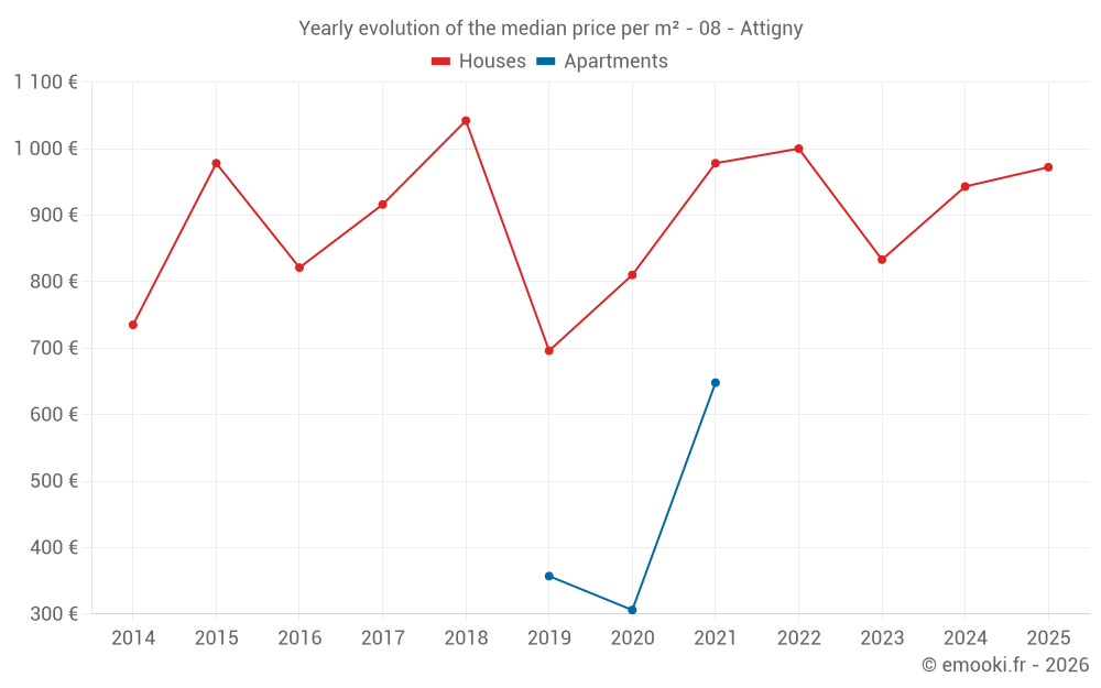 The median price on the 29 house transactions of the last 24 months in the municipality of Attigny was 844 € per square meter for a median property value of 80 000 €. Over this period, 60% of transactions were between 650 and 1 181 € per square meter (from the 2nd to the 8th deciles).