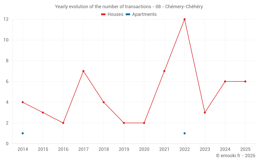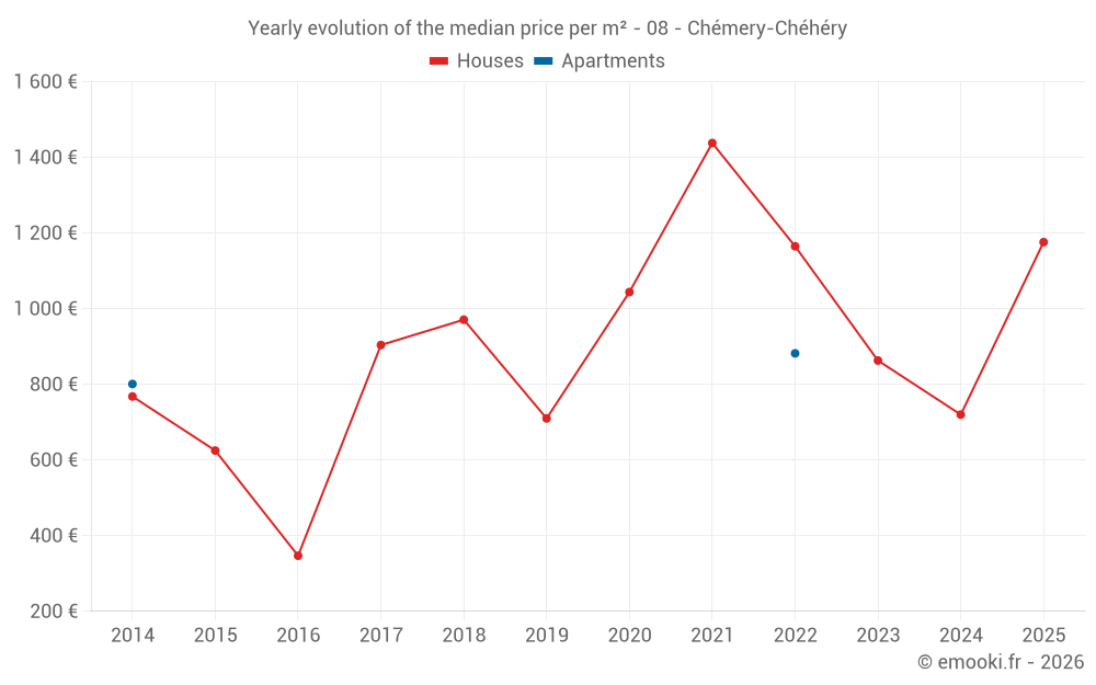 The median price on the 14 house transactions of the last 24 months in the municipality of Chémery-Chéhéry was 843 € per square meter for a median property value of 128 000 €. Over this period, 60% of transactions were between 638 and 1 538 € per square meter (from the 2nd to the 8th deciles).