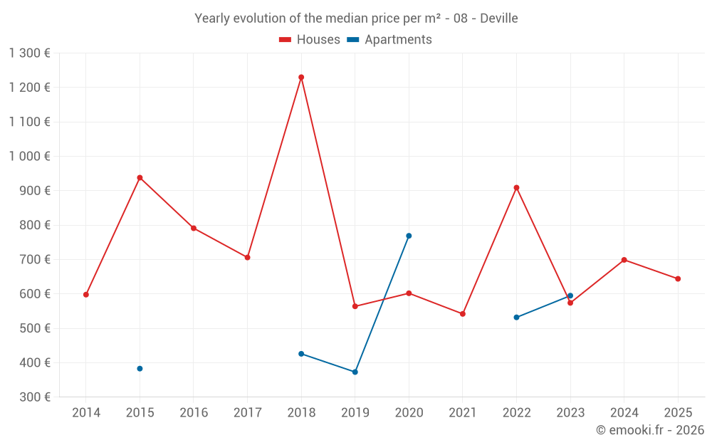 The median price on the 26 house transactions of the last 24 months in the municipality of Deville was 666 € per square meter for a median property value of 63 750 €. Over this period, 60% of transactions were between 385 and 1 182 € per square meter (from the 2nd to the 8th deciles).