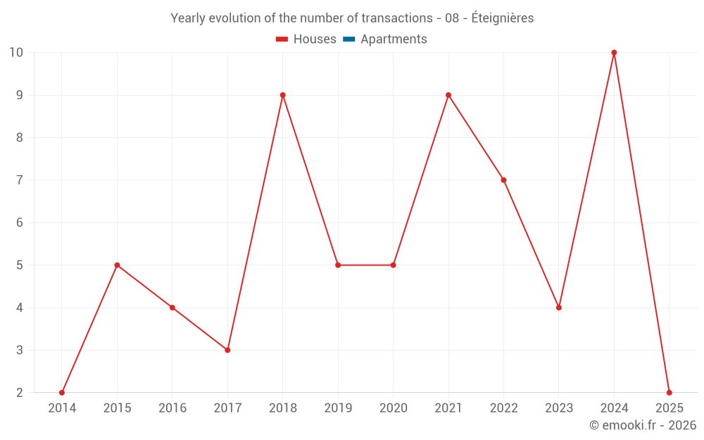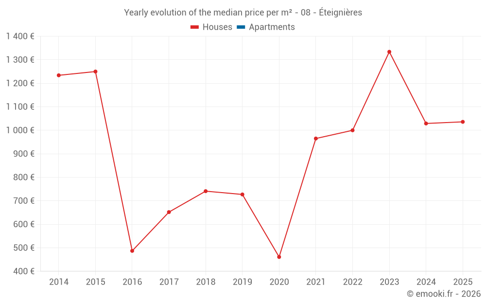 The median price on the 14 house transactions of the last 24 months in the municipality of Éteignières was 1 159 € per square meter for a median property value of 142 000 €. Over this period, 60% of transactions were between 790 and 1 669 € per square meter (from the 2nd to the 8th deciles).