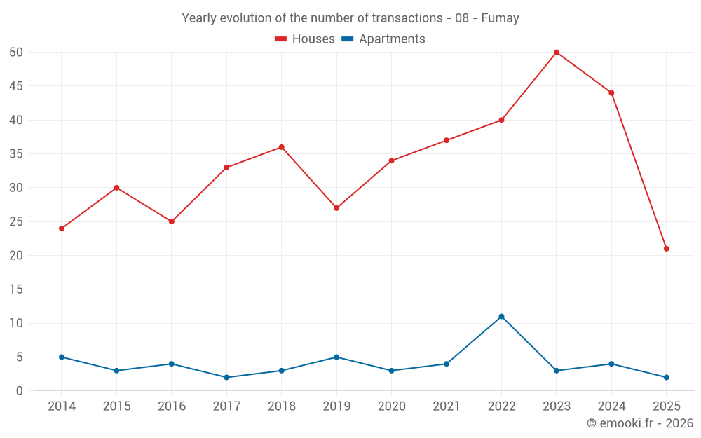 The median price on the 21 house transactions of the last 6 months in the municipality of Fumay was 686 € per square meter for a median property value of 41 000 €. Over this period, 60% of transactions were between 257 and 1 412 € per square meter (from the 2nd to the 8th deciles).