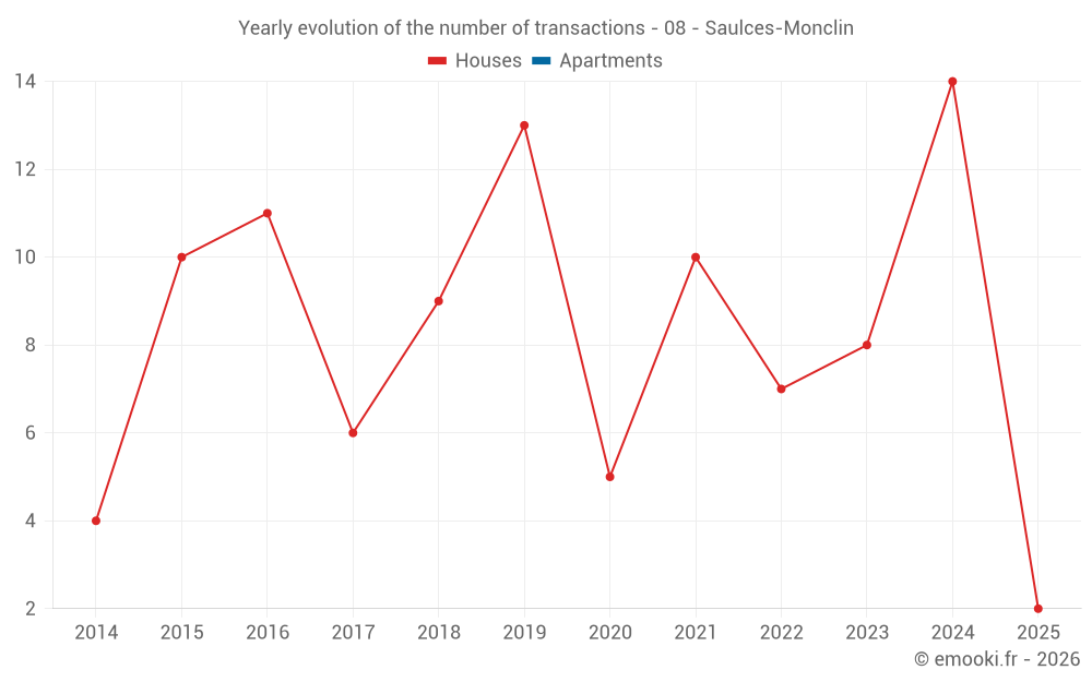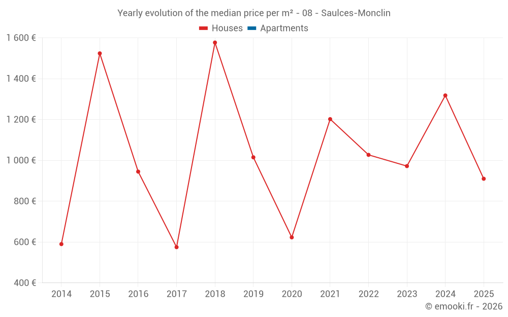 The median price on the 22 house transactions of the last 24 months in the municipality of Saulces-Monclin was 1 094 € per square meter for a median property value of 124 517 €. Over this period, 60% of transactions were between 703 and 1 543 € per square meter (from the 2nd to the 8th deciles).