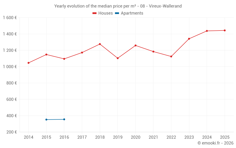 The median price on the 24 house transactions of the last 12 months in the municipality of Vireux-Wallerand was 1 480 € per square meter for a median property value of 126 500 €. Over this period, 60% of transactions were between 1 187 and 1 849 € per square meter (from the 2nd to the 8th deciles).