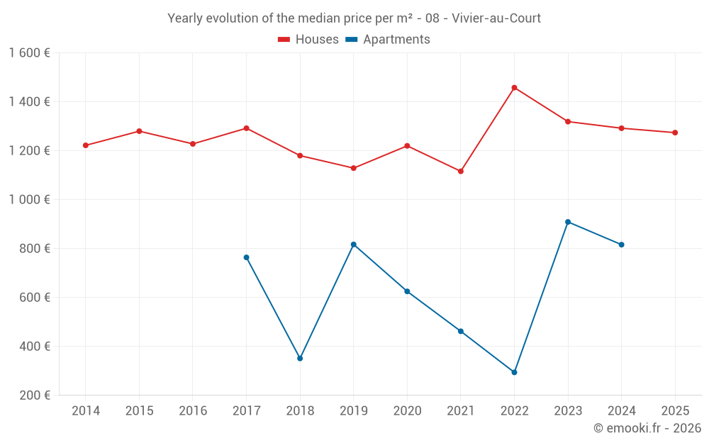 The median price on the 33 house transactions of the last 12 months in the municipality of Vivier-au-Court was 1 364 € per square meter for a median property value of 120 000 €. Over this period, 60% of transactions were between 949 and 1 815 € per square meter (from the 2nd to the 8th deciles).