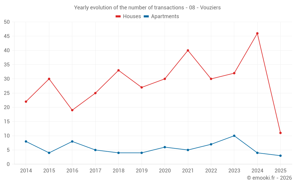 The median price on the 40 house transactions of the last 12 months in the municipality of Vouziers was 845 € per square meter for a median property value of 77 500 €. Over this period, 60% of transactions were between 443 and 1 237 € per square meter (from the 2nd to the 8th deciles).