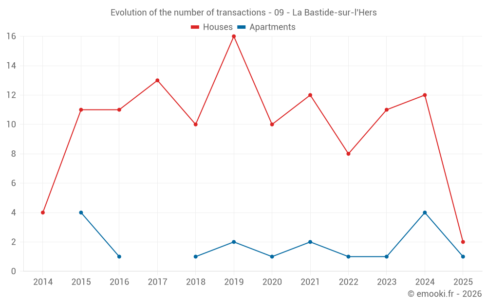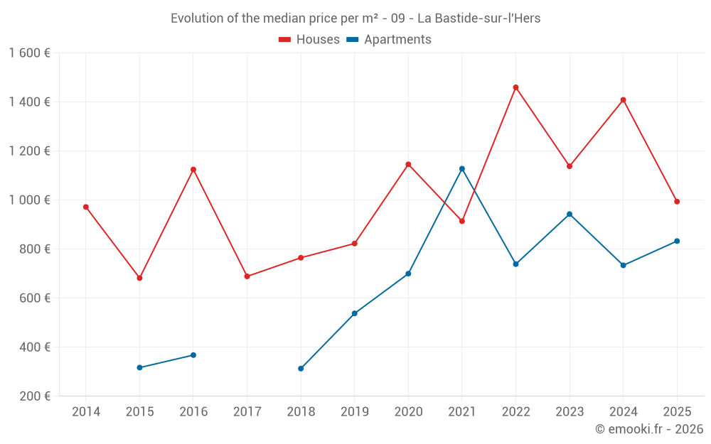 The median price on the 20 house transactions of the last 24 months in the municipality of La Bastide-sur-l'Hers was 1 280 € per square meter for a median property value of 115 000 €. Over this period, 60% of transactions were between 844 and 1 511 € per square meter (from the 2nd to the 8th deciles).