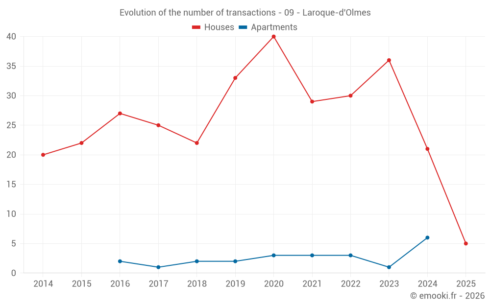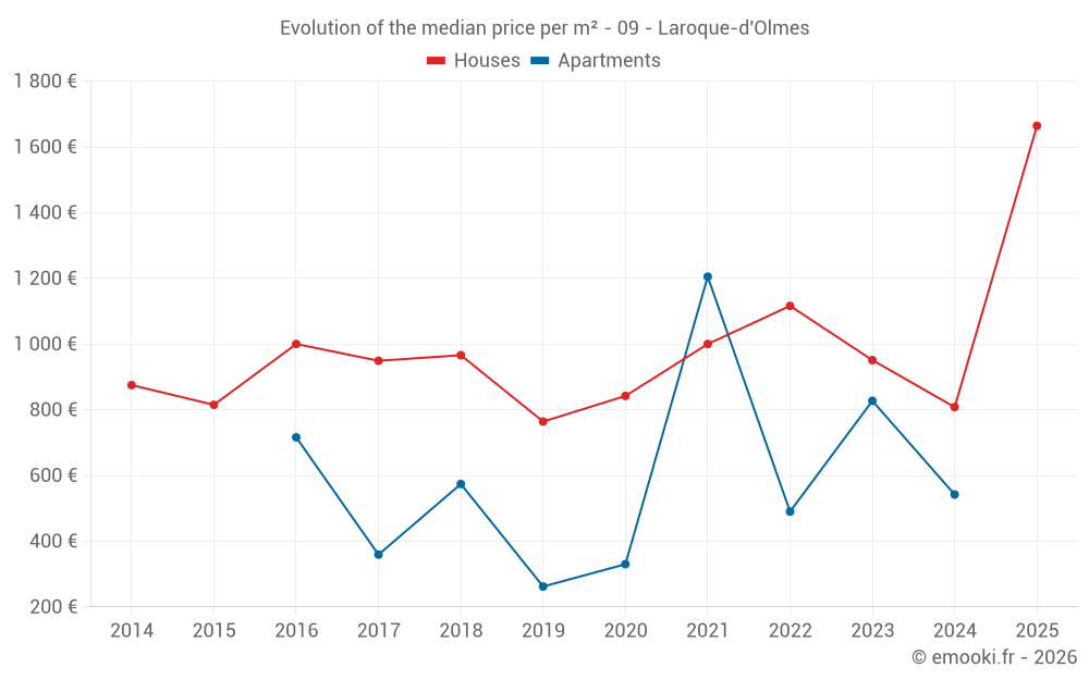 The median price on the 16 house transactions of the last 12 months in the municipality of Laroque-d'Olmes was 1 518 € per square meter for a median property value of 138 750 €. Over this period, 60% of transactions were between 618 and 2 151 € per square meter (from the 2nd to the 8th deciles).