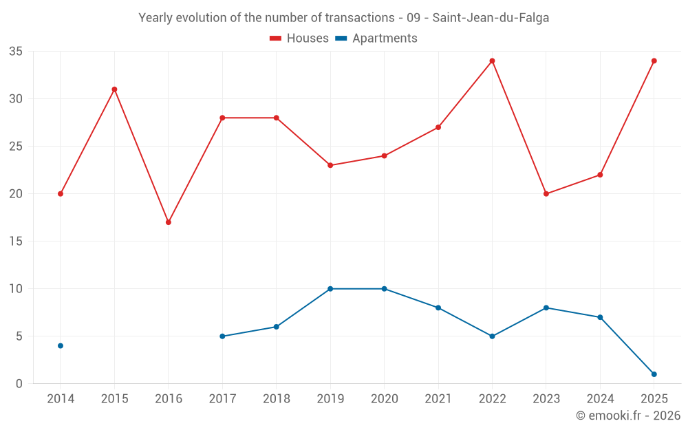 The median price on the 34 house transactions of the last 12 months in the municipality of Saint-Jean-du-Falga was 1 853 € per square meter for a median property value of 183 505 €. Over this period, 60% of transactions were between 1 559 and 2 343 € per square meter (from the 2nd to the 8th deciles).