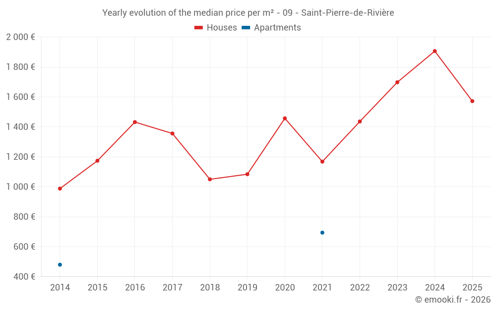 The median price on the 15 house transactions of the last 24 months in the municipality of Saint-Pierre-de-Rivière was 1 798 € per square meter for a median property value of 170 000 €. Over this period, 60% of transactions were between 999 and 2 196 € per square meter (from the 2nd to the 8th deciles).