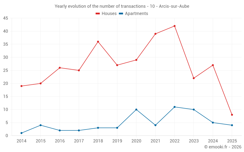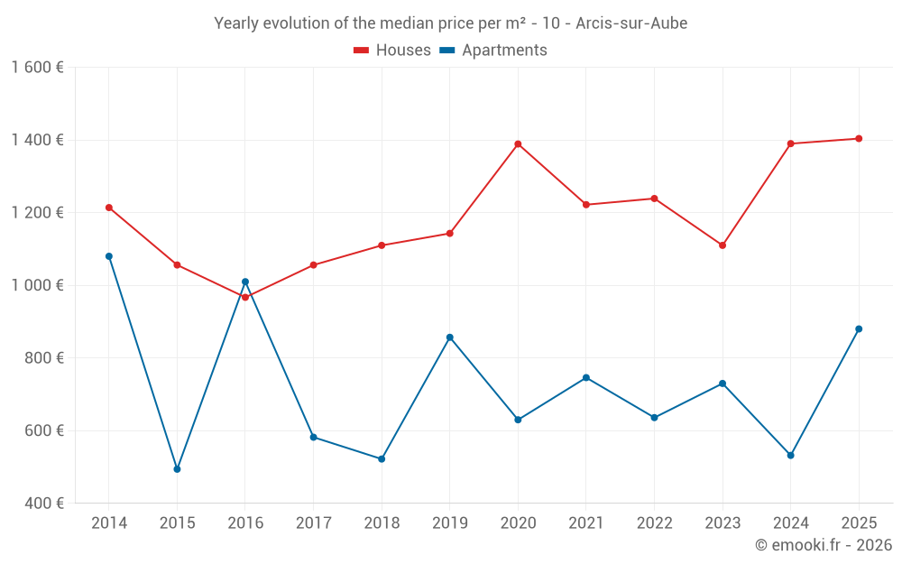 The median price on the 23 house transactions of the last 12 months in the municipality of Arcis-sur-Aube was 1 392 € per square meter for a median property value of 130 000 €. Over this period, 60% of transactions were between 888 and 1 620 € per square meter (from the 2nd to the 8th deciles).