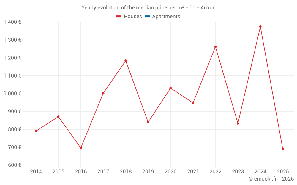 The median price on the 16 house transactions of the last 24 months in the municipality of Auxon was 1 355 € per square meter for a median property value of 155 000 €. Over this period, 60% of transactions were between 970 and 1 648 € per square meter (from the 2nd to the 8th deciles).