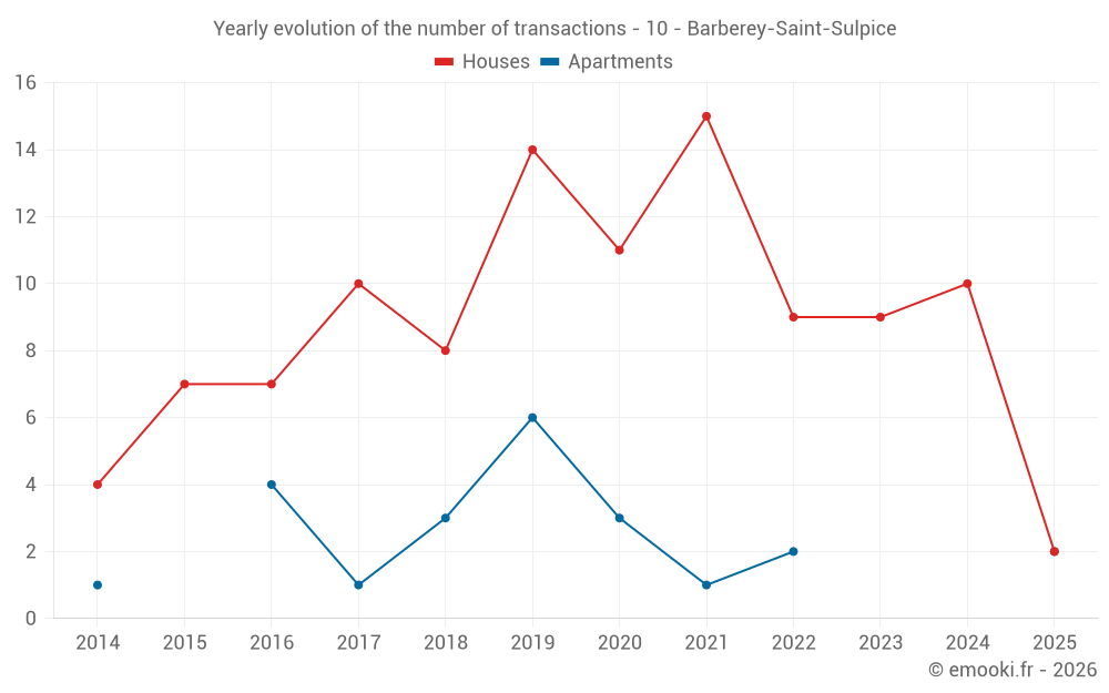 The median price on the 14 house transactions of the last 24 months in the municipality of Barberey-Saint-Sulpice was 1 903 € per square meter for a median property value of 208 362 €. Over this period, 60% of transactions were between 1 685 and 2 660 € per square meter (from the 2nd to the 8th deciles).