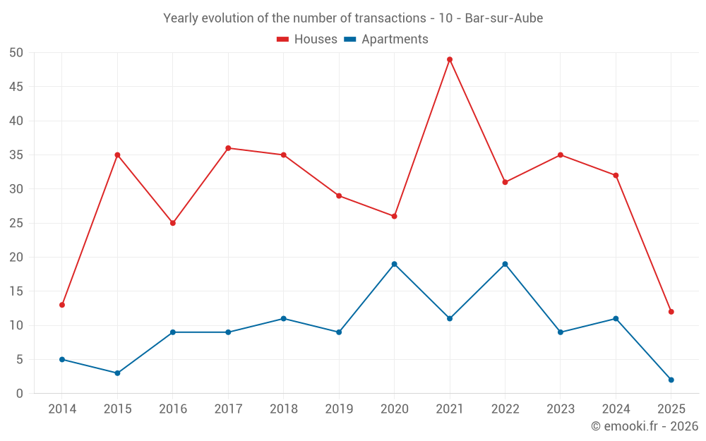 The median price on the 36 house transactions of the last 12 months in the municipality of Bar-sur-Aube was 926 € per square meter for a median property value of 98 500 €. Over this period, 60% of transactions were between 463 and 1 424 € per square meter (from the 2nd to the 8th deciles).