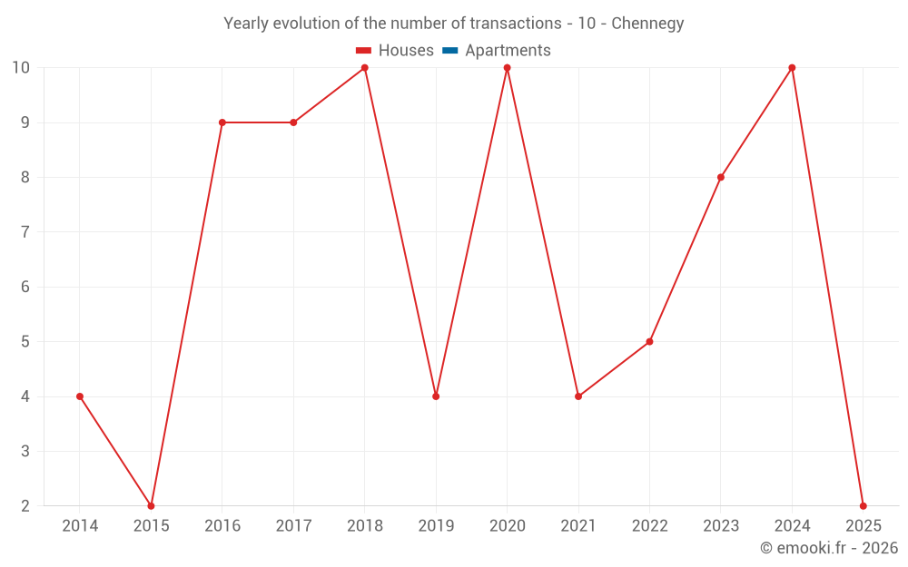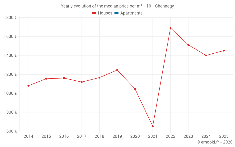 The median price on the 16 house transactions of the last 24 months in the municipality of Chennegy was 1 460 € per square meter for a median property value of 135 500 €. Over this period, 60% of transactions were between 833 and 1 633 € per square meter (from the 2nd to the 8th deciles).