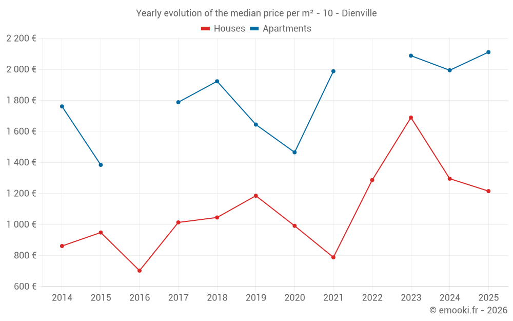 The median price on the 17 house transactions of the last 24 months in the municipality of Dienville was 1 258 € per square meter for a median property value of 110 000 €. Over this period, 60% of transactions were between 746 and 1 601 € per square meter (from the 2nd to the 8th deciles).