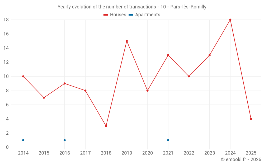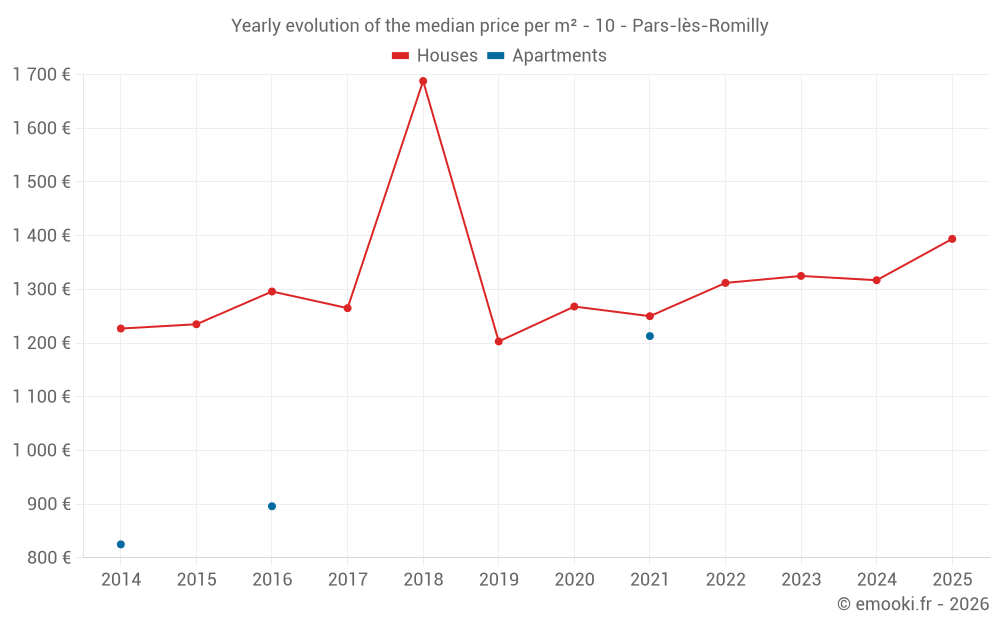 The median price on the 26 house transactions of the last 24 months in the municipality of Pars-lès-Romilly was 1 330 € per square meter for a median property value of 127 250 €. Over this period, 60% of transactions were between 1 059 and 1 656 € per square meter (from the 2nd to the 8th deciles).