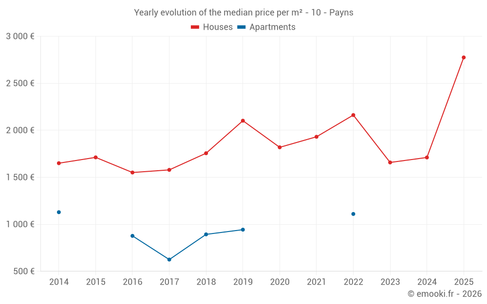 The median price on the 20 house transactions of the last 24 months in the municipality of Payns was 1 789 € per square meter for a median property value of 194 500 €. Over this period, 60% of transactions were between 1 495 and 2 207 € per square meter (from the 2nd to the 8th deciles).
