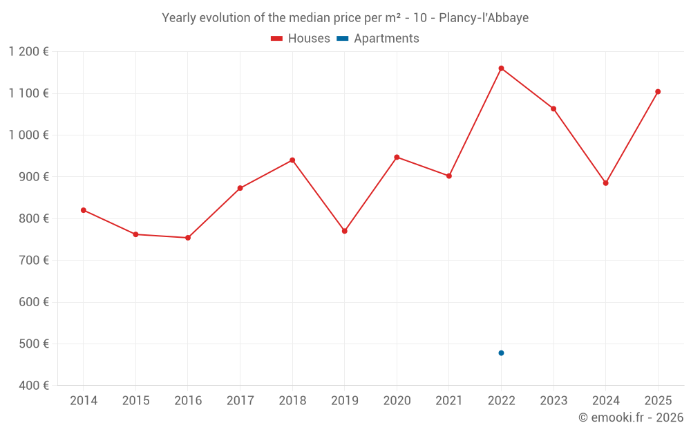 The median price on the 23 house transactions of the last 24 months in the municipality of Plancy-l'Abbaye was 1 063 € per square meter for a median property value of 120 000 €. Over this period, 60% of transactions were between 679 and 1 377 € per square meter (from the 2nd to the 8th deciles).