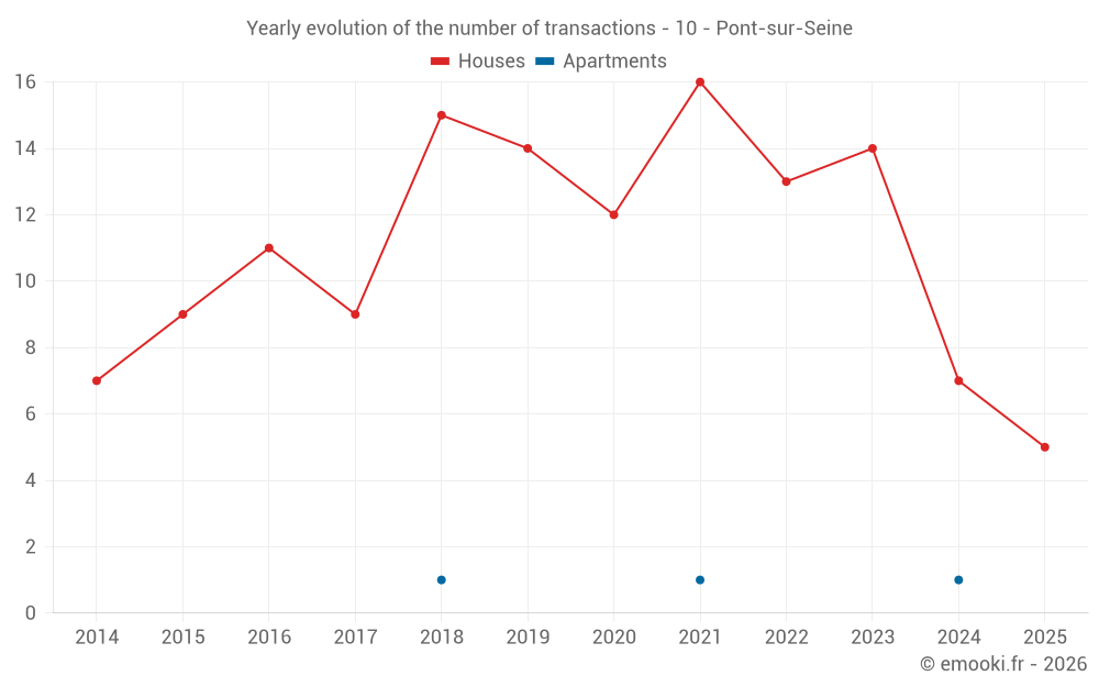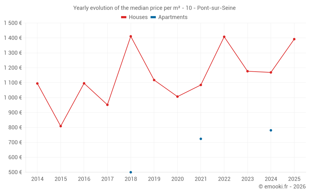 The median price on the 20 house transactions of the last 24 months in the municipality of Pont-sur-Seine was 1 247 € per square meter for a median property value of 123 250 €. Over this period, 60% of transactions were between 756 and 1 577 € per square meter (from the 2nd to the 8th deciles).