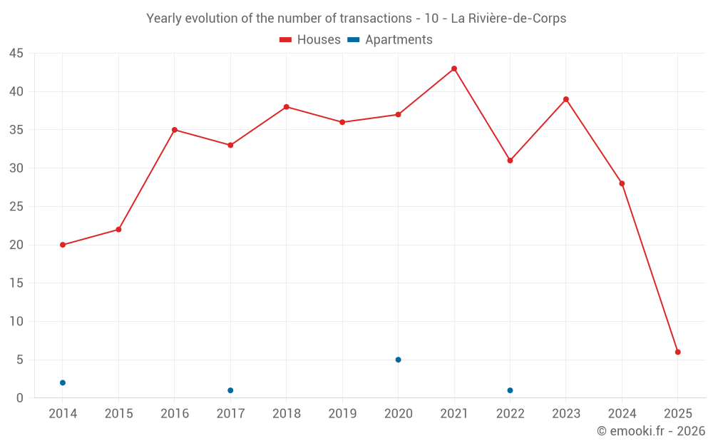 The median price on the 27 house transactions of the last 12 months in the municipality of La Rivière-de-Corps was 2 188 € per square meter for a median property value of 210 000 €. Over this period, 60% of transactions were between 1 856 and 2 603 € per square meter (from the 2nd to the 8th deciles).