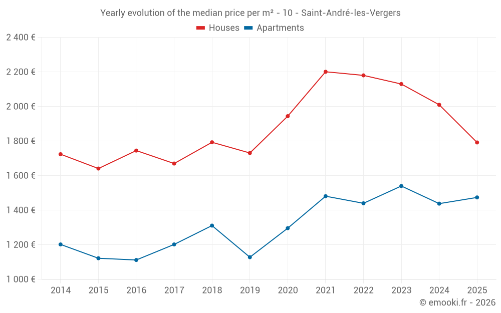 The median price on the 18 house transactions of the last 6 months in the municipality of Saint-André-les-Vergers was 1 792 € per square meter for a median property value of 154 550 €. Over this period, 60% of transactions were between 1 736 and 2 096 € per square meter (from the 2nd to the 8th deciles).