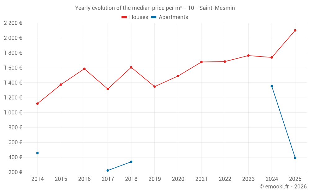 The median price on the 14 house transactions of the last 24 months in the municipality of Saint-Mesmin was 1 769 € per square meter for a median property value of 139 000 €. Over this period, 60% of transactions were between 1 473 and 2 104 € per square meter (from the 2nd to the 8th deciles).