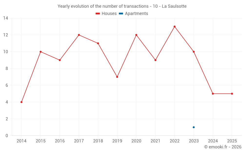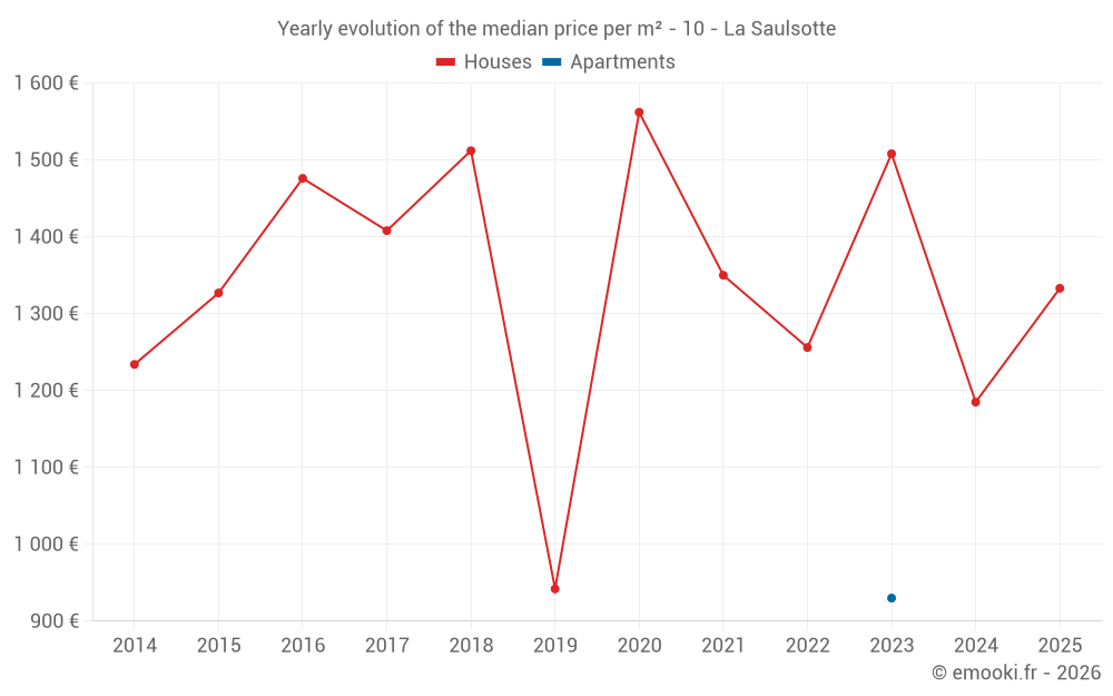 The median price on the 16 house transactions of the last 24 months in the municipality of La Saulsotte was 1 332 € per square meter for a median property value of 139 750 €. Over this period, 60% of transactions were between 1 086 and 1 685 € per square meter (from the 2nd to the 8th deciles).
