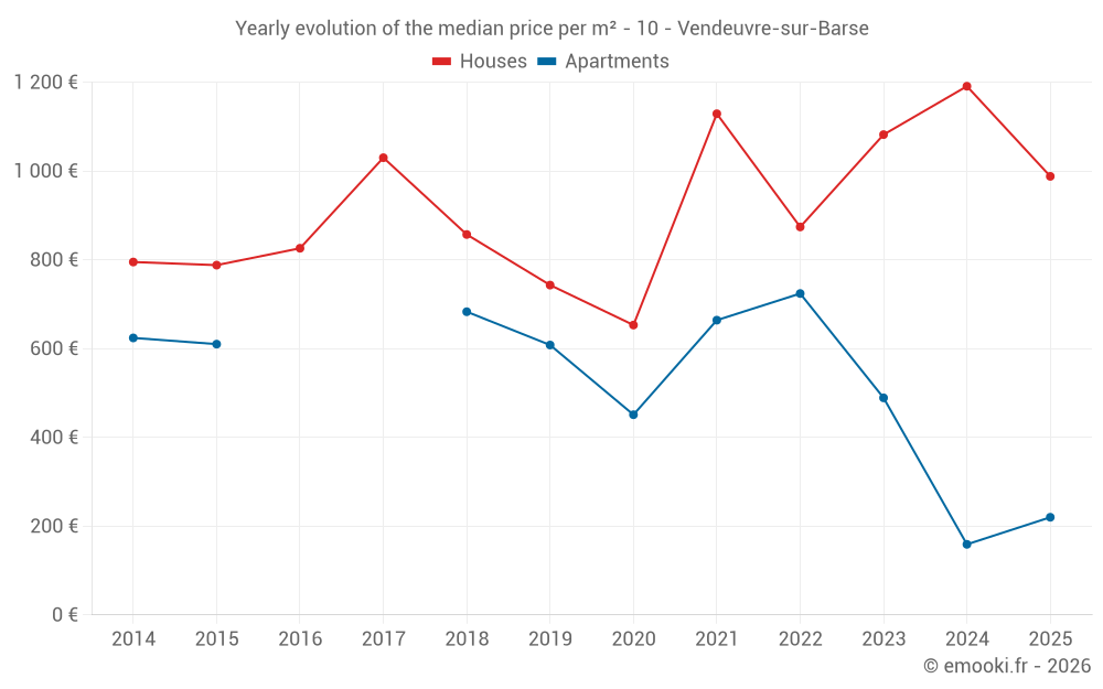 The median price on the 24 house transactions of the last 24 months in the municipality of Vendeuvre-sur-Barse was 1 066 € per square meter for a median property value of 91 750 €. Over this period, 60% of transactions were between 467 and 1 356 € per square meter (from the 2nd to the 8th deciles).