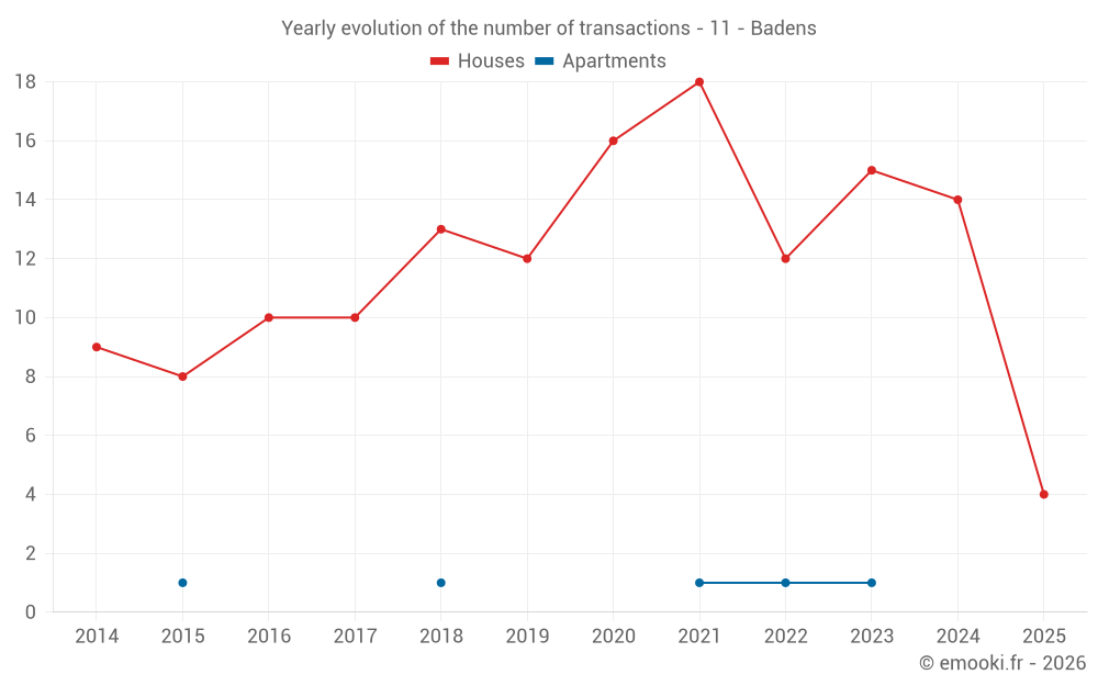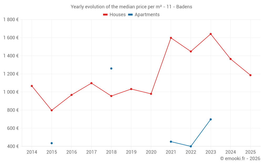 The median price on the 26 house transactions of the last 24 months in the municipality of Badens was 1 520 € per square meter for a median property value of 138 650 €. Over this period, 60% of transactions were between 523 and 2 277 € per square meter (from the 2nd to the 8th deciles).
