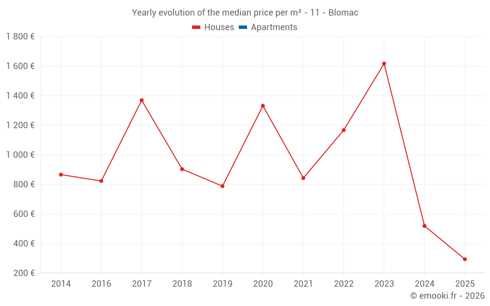 The median price on the 14 house transactions of the last 24 months in the municipality of Blomac was 576 € per square meter for a median property value of 54 500 €. Over this period, 60% of transactions were between 309 and 1 257 € per square meter (from the 2nd to the 8th deciles).