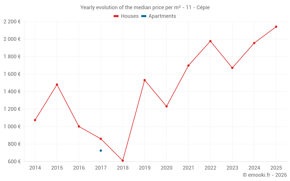 The median price on the 17 house transactions of the last 24 months in the municipality of Cépie was 1 955 € per square meter for a median property value of 202 000 €. Over this period, 60% of transactions were between 1 306 and 2 152 € per square meter (from the 2nd to the 8th deciles).