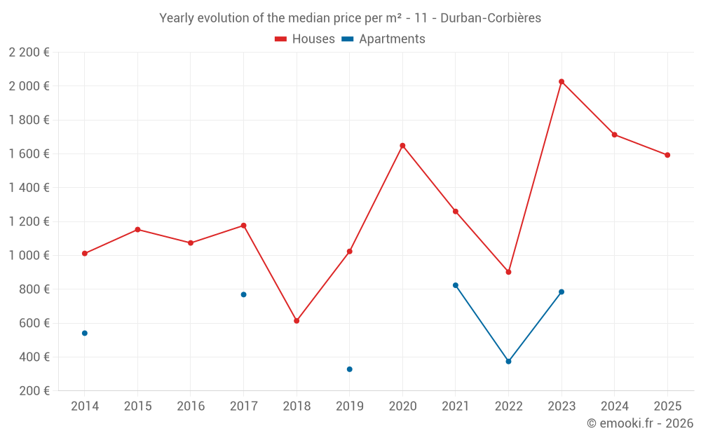 The price per m² of houses has decreased by 21% since 2 years, but it has increased by 159% in 7 years.