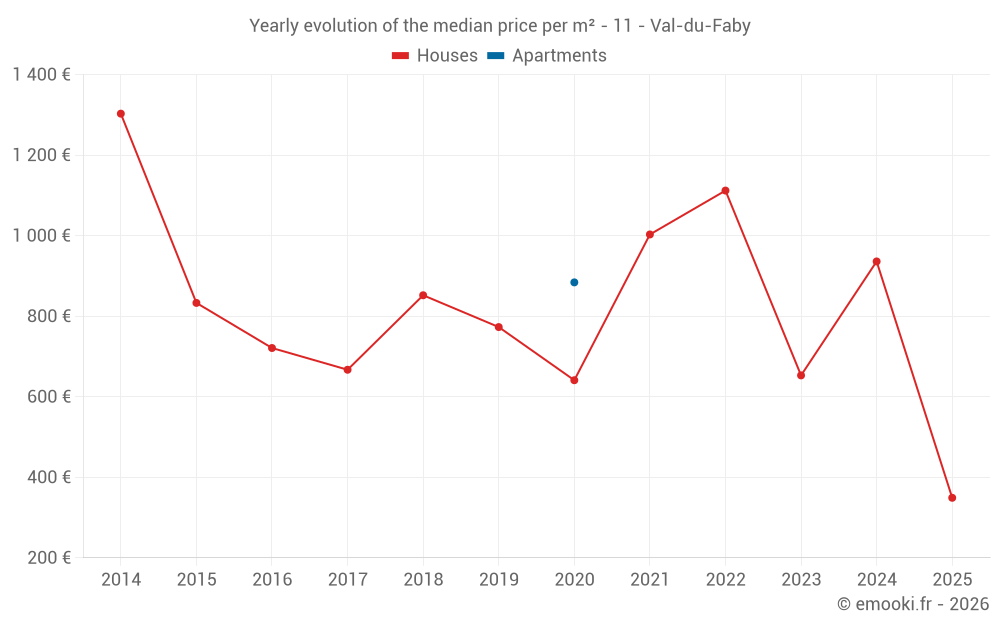 The median price on the 18 house transactions of the last 24 months in the municipality of Val-du-Faby was 724 € per square meter for a median property value of 80 000 €. Over this period, 60% of transactions were between 430 and 1 352 € per square meter (from the 2nd to the 8th deciles).