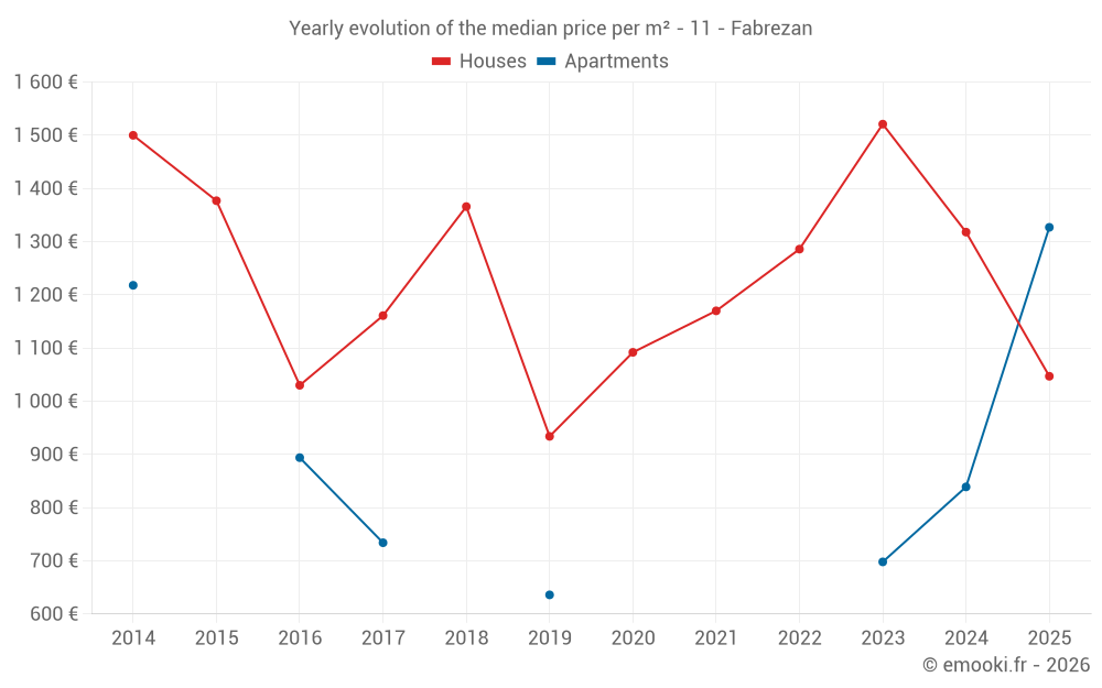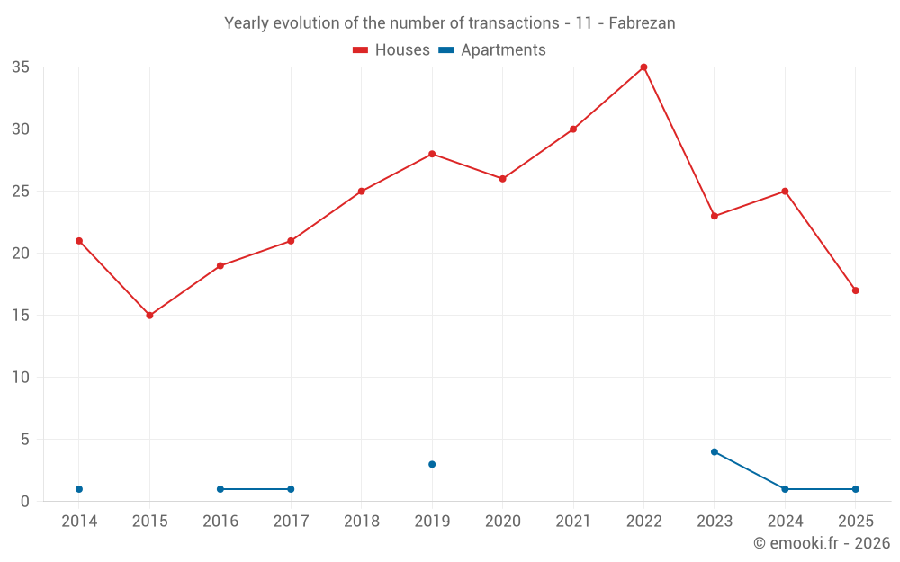 The median price on the 32 house transactions of the last 12 months in the municipality of Fabrezan was 1 097 € per square meter for a median property value of 112 850 €. Over this period, 60% of transactions were between 729 and 2 276 € per square meter (from the 2nd to the 8th deciles).
