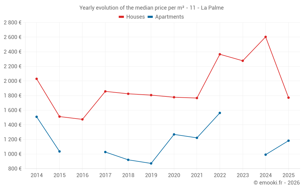 The median price on the 31 house transactions of the last 12 months in the municipality of La Palme was 2 604 € per square meter for a median property value of 256 800 €. Over this period, 60% of transactions were between 1 222 and 3 144 € per square meter (from the 2nd to the 8th deciles).