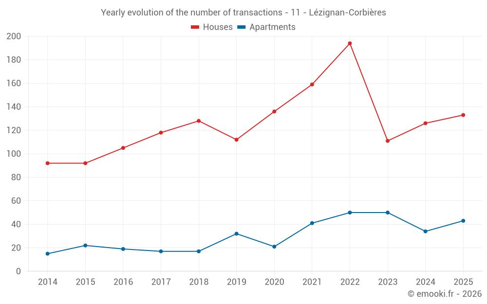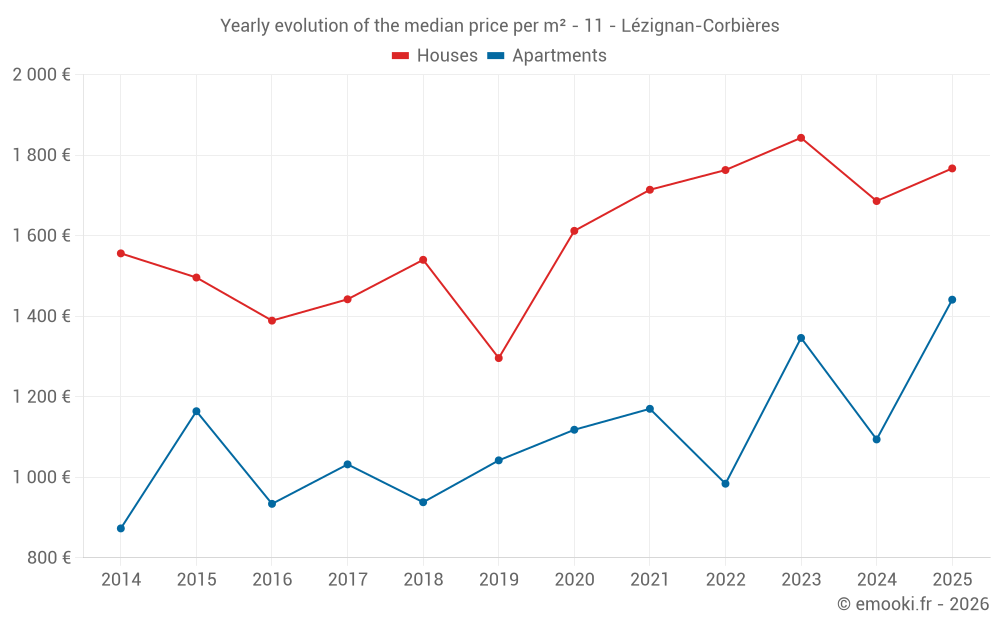 The median price on the 33 house transactions of the last 3 months in the municipality of Lézignan-Corbières was 1 760 € per square meter for a median property value of 149 500 €. Over this period, 60% of transactions were between 1 097 and 2 361 € per square meter (from the 2nd to the 8th deciles).