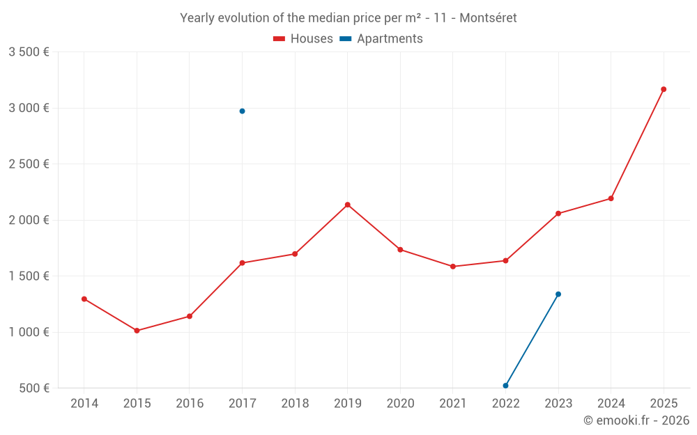 The median price on the 20 house transactions of the last 24 months in the municipality of Montséret was 2 229 € per square meter for a median property value of 191 675 €. Over this period, 60% of transactions were between 1 238 and 2 574 € per square meter (from the 2nd to the 8th deciles).