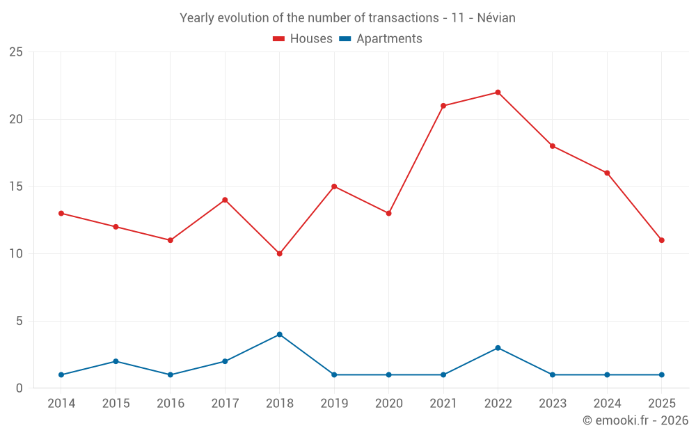 The median price on the 27 house transactions of the last 24 months in the municipality of Névian was 2 000 € per square meter for a median property value of 185 300 €. Over this period, 60% of transactions were between 1 111 and 2 913 € per square meter (from the 2nd to the 8th deciles).